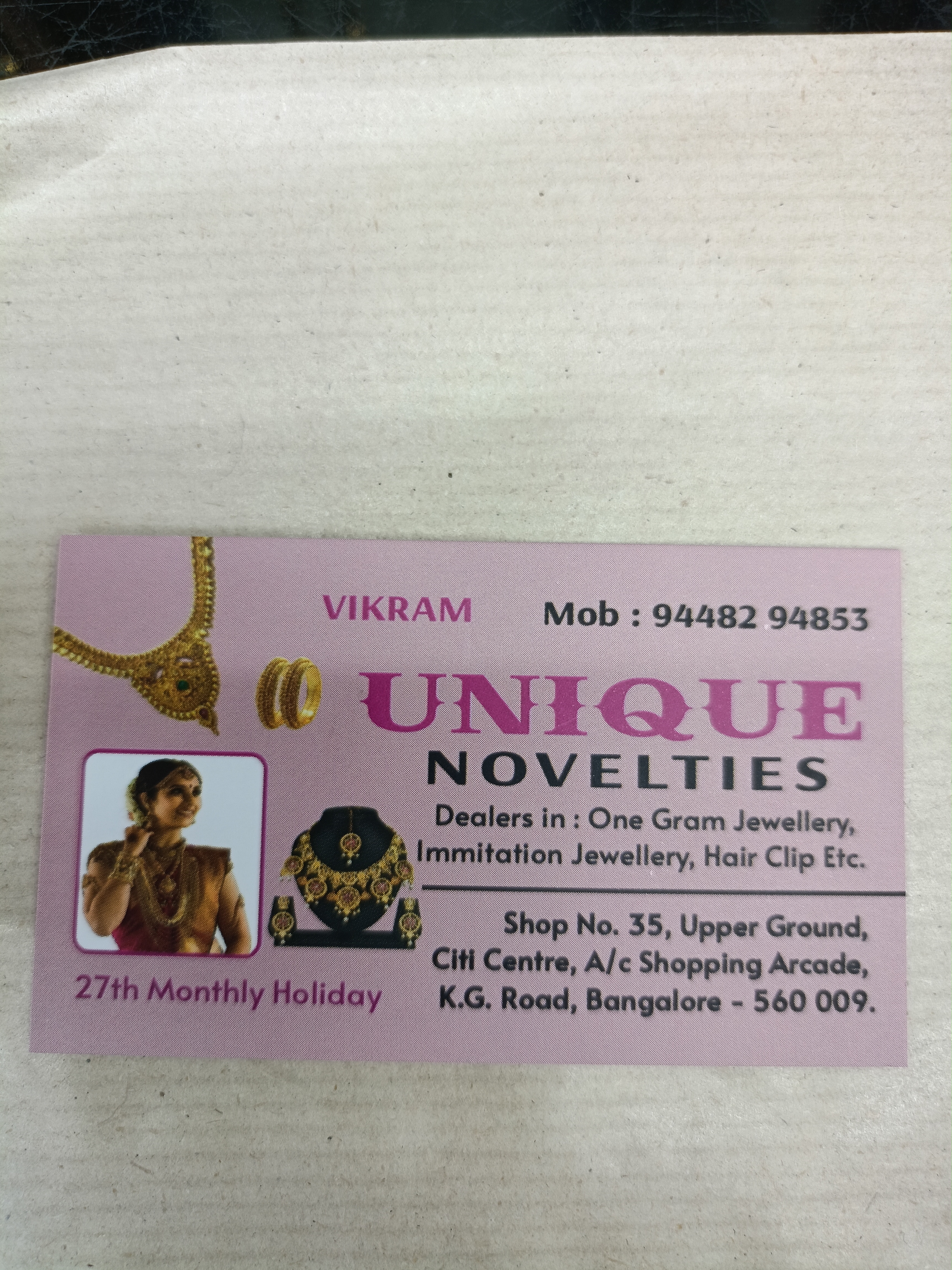 Unique Novelties Shop no. UG 35 Citi center A/c shopping Arcade k.g. road Bangalore 560009