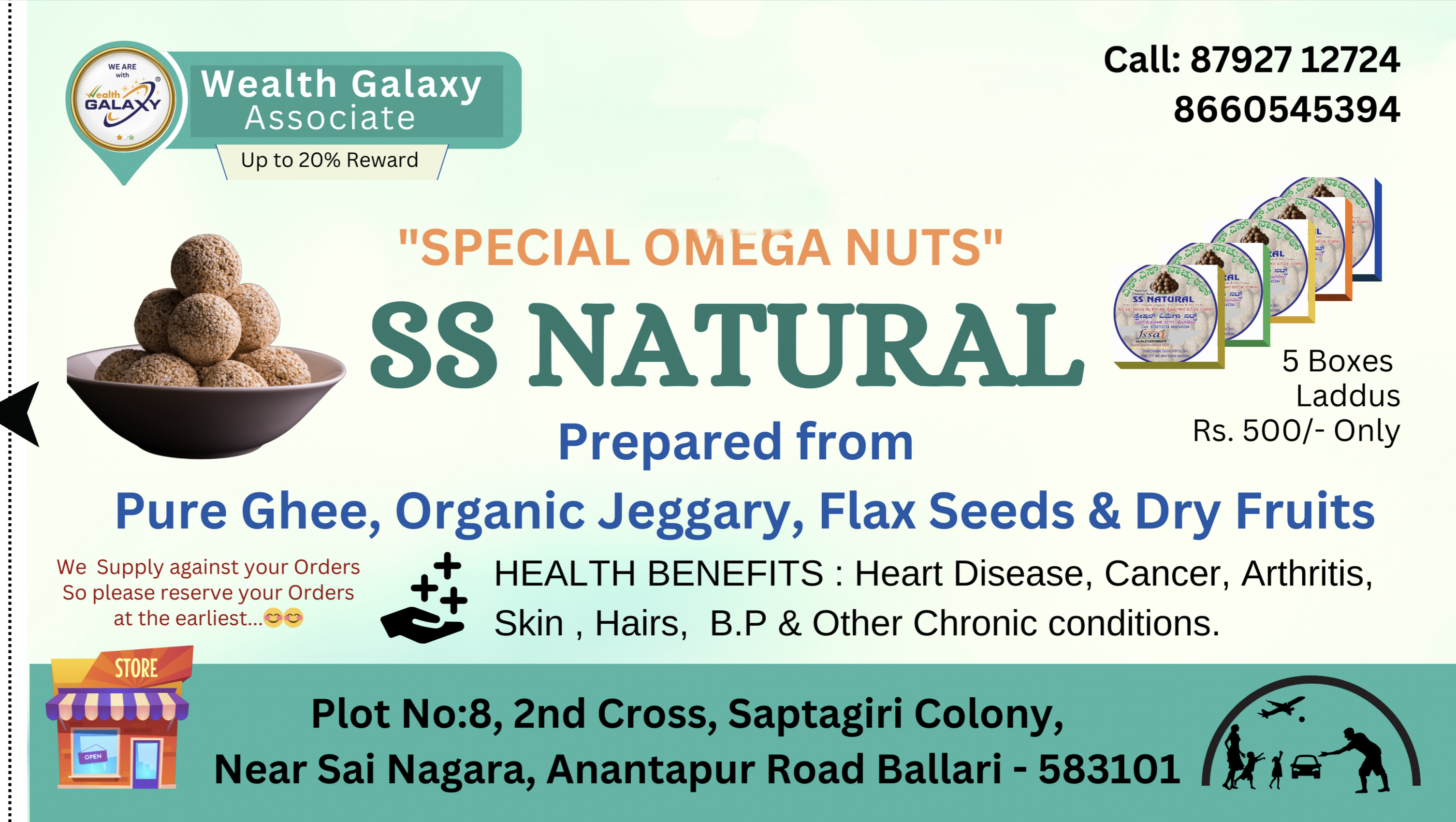 Dear Sir / Madam,Here we are launching a new home made product "SPECIAL OMEGA NUTS".Prepared from Pure Ghee, Organic jeggary, Flax seeds & dry fruitsHEALTH BENEFITS :Heart Disease, Cancer , Arthritis , Skin , Hairs, B.P & Other Chronic conditions.We supply against your orders , so please reserve your orders at the earliest...??Also Tubeless Tyre puncture sealant for safety & tension less travels.Upcoming Organic Mushroom Fresh & it's Byproducts like Mushroom Pickle , Mushroom soup powder , Mushroom tea powder, Mushroom Kheer,Mushroom papad..etc...